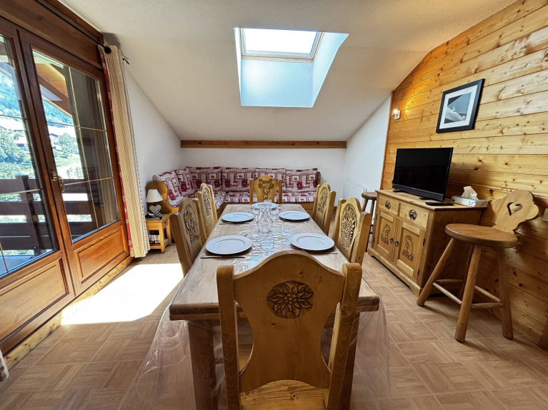 Appartement au pied des pistes de l'Espace Diamant pour six personnes au premier étage avec une grande terrasse de 10 m² offrant une belle vue montagnes.