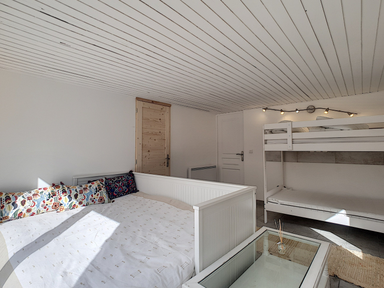 Chambre 3 : 2 lits superposés en 90x190 avec couettes et 1 banquette lit en 2 fois 80x200 avec couette ( soit 4 couchages)