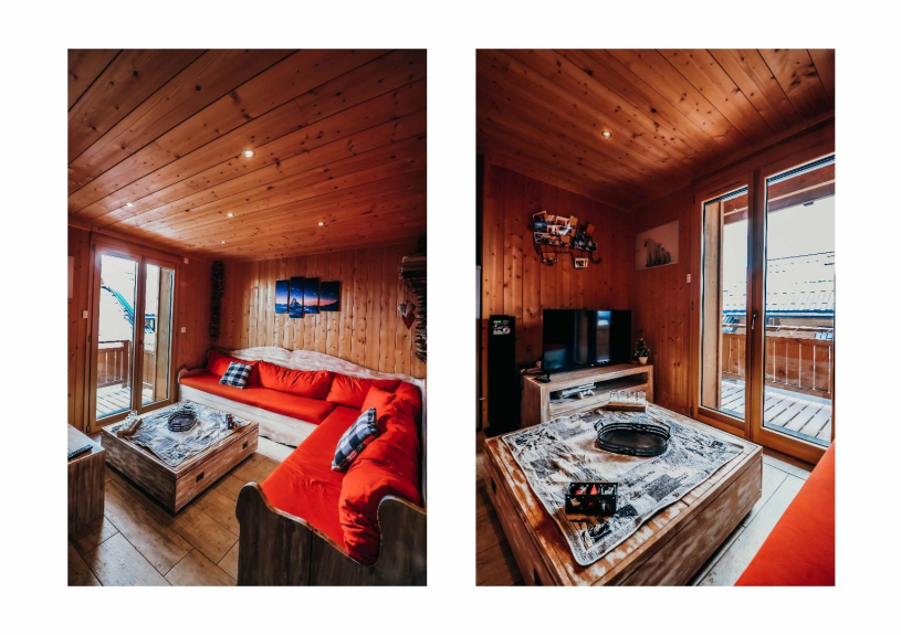 - SALON = grande banquette, table basse, TV écran plat, barre de son, jeux de société, Play station, livres.