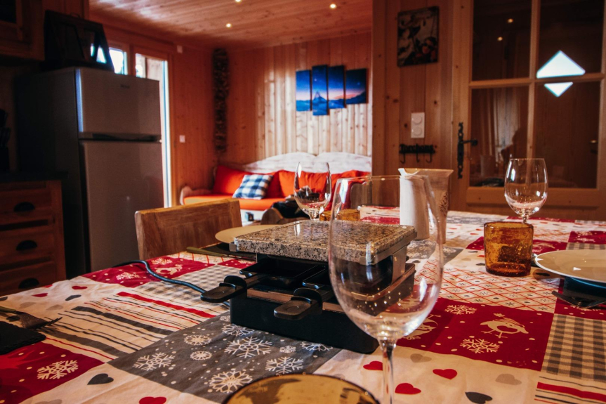 - CUISINE = 1 plaque à induction 4 feux, hotte, lave-vaisselle, réfrigérateur avec partie congélateur, four, micro-ondes, cafetière classique, cafetière Nespresso, bouilloire, lave-linge, grille-pain, appareil à raclette et fondue.