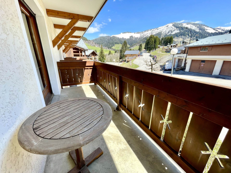 Appartement de 40m² au pied des pistes du Mont Rond, de trois pièces pour six personnes, au premier étage, balcon SUD vue sur les pistes et balcon OUEST vue sur le Mont Charvin et la vallée.
