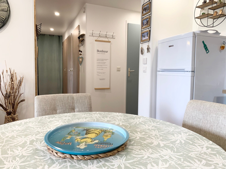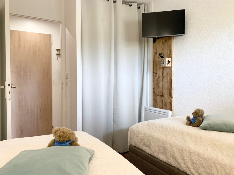 Cuisine ouverte sur séjour pièce principale avec couchage double canapé, une chambre lit double et une chambre deux lits simples. Une salle de bain, une salle de douche. Toilette séparé. Casier à skis.