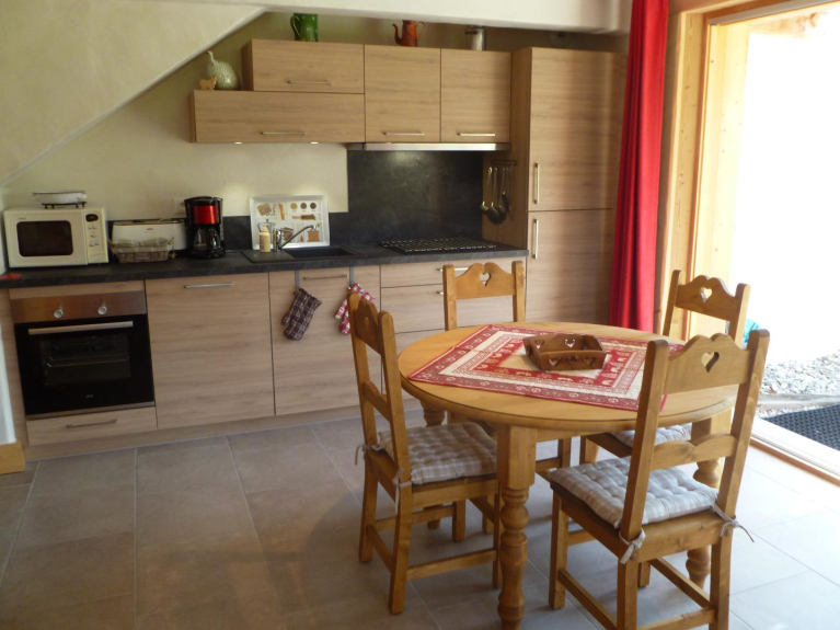 Appartement de charme classé 3* . Situé au rez de jardin d'un beau chalet datant de 2015 ( accès par escalier extérieur). Pelouse, terrasse, place parking extérieur et local skis extérieur en hiver. Décoration style "montagne" soignée et appartement très bien équipé.