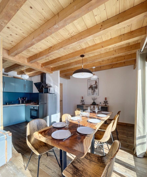 Le chalet se compose d’une pièce de vie avec cuisine équipée de tout le confort nécessaire (lave-vaisselle, plaque à induction, four, four à micro-onde, machine à café filtre, grille-pain, ensemble à raclette, ensemble à fondue, bouilloire, presse-agrume et pierrade) tandis que le salon propose un espace TV.