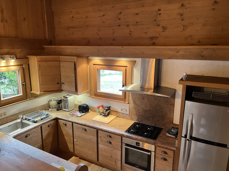 Une cuisine équipée avec bar ouvert sur salle à manger avec poêle à bois. Une grande mezzanine avec un lit double.