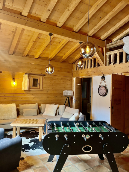 Un salon avec grand canapé coin TV et Baby Foot. Une seconde chambre en suite avec lit double et salle de bain attenante.