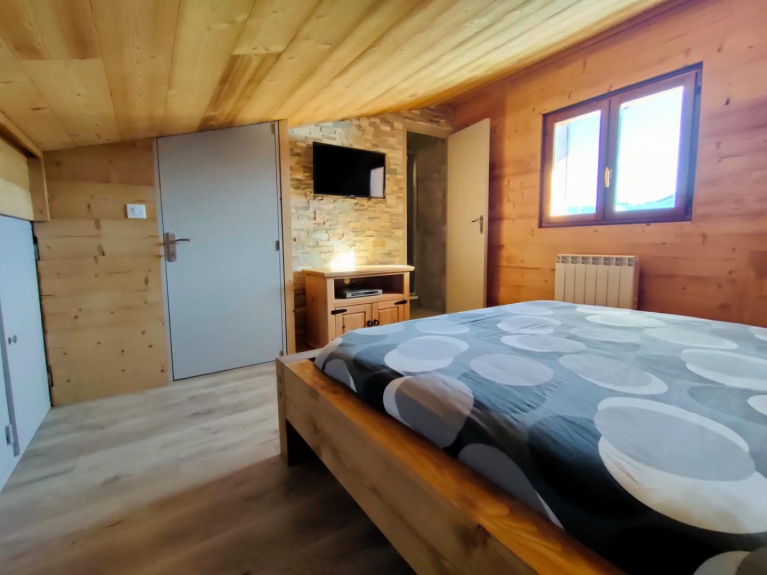 A l’étage se trouve une chambre avec un lit 2 personnes de 160 et sa salle de douche attenante.
