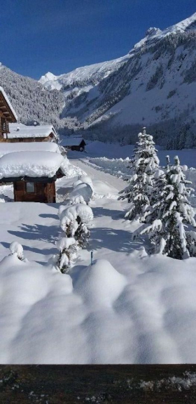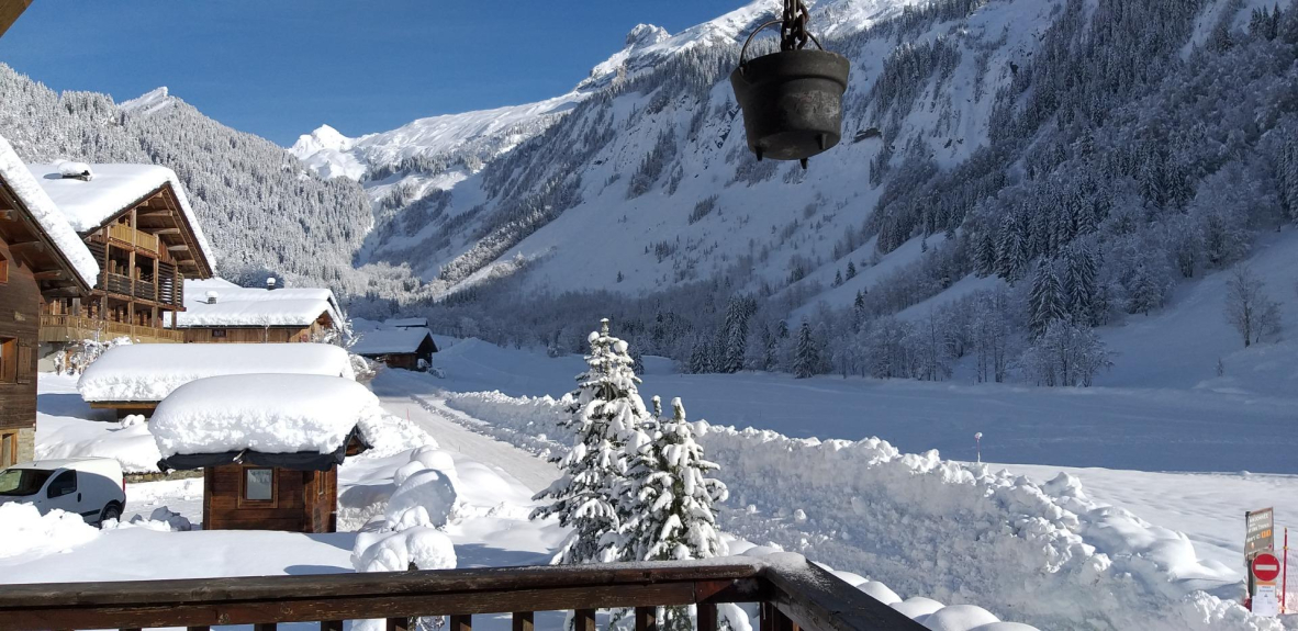 Depuis le chalet vue dégagée et ensoleillée sur les pistes de ski de fond, la montagne la Pointe Percée ainsi que sur les vieux chalets savoyards.