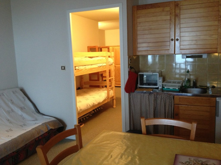Cet appartement propose à l'entrée, dégagement en L distribuant 1 chambre avec 2 lits simples, son coin montagne avec ses 2 lits superposés et son armoire, une salle de bain, wc, salon-séjour avec clic clac , kitchenette