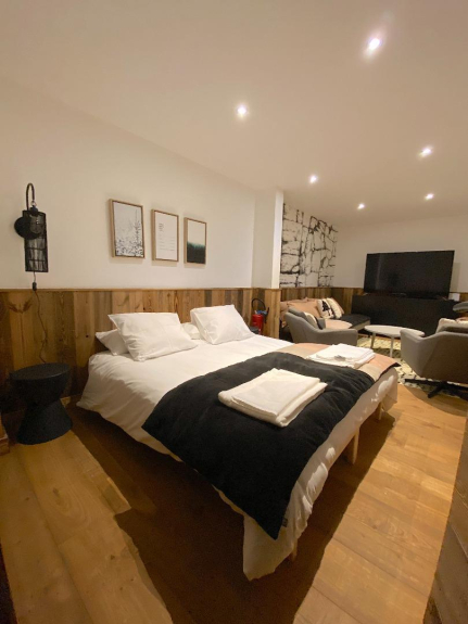 - 1 suite composée d'un Lit 180x200 sous comble avec canapé convertible pouvant accueillir 2 couchages supplémentaires et un espace bureau et une salle de bain et de douche avec vue sur les pistes.