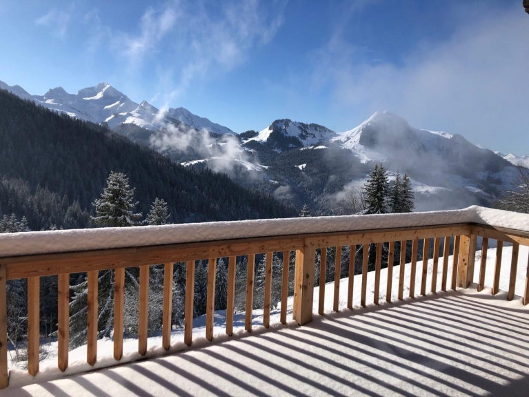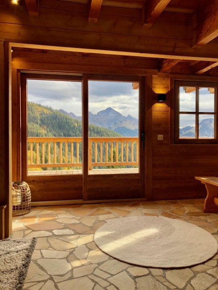 Élégant chalet traditionnel de 170m² sur 3 niveaux, exposé plein sud avec une vue imprenable sur la vallée de Manigod depuis la grande terrasse.
