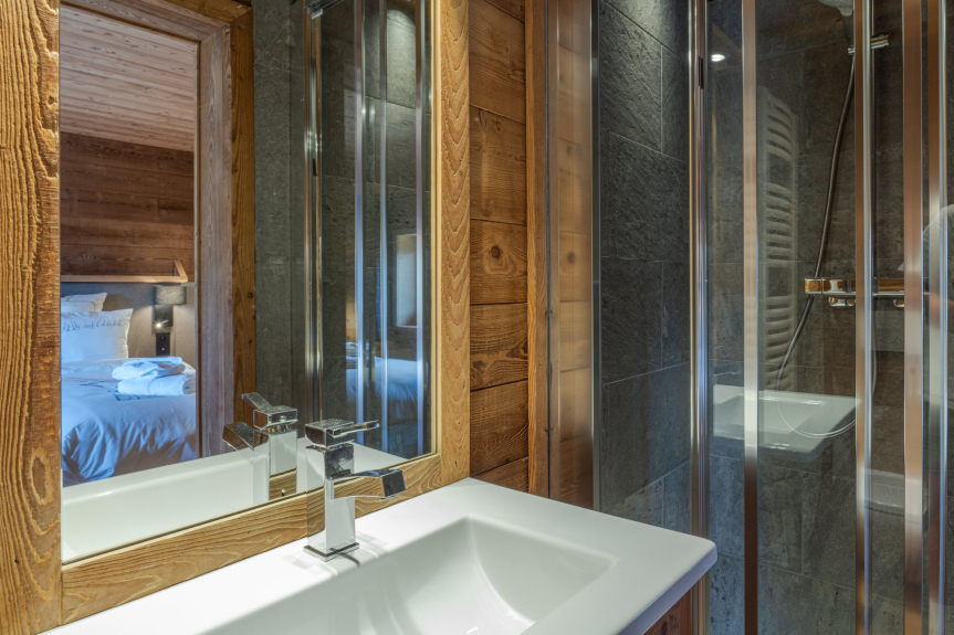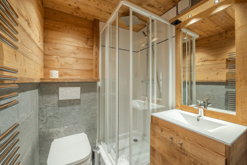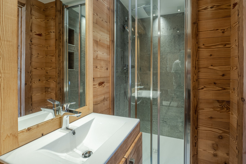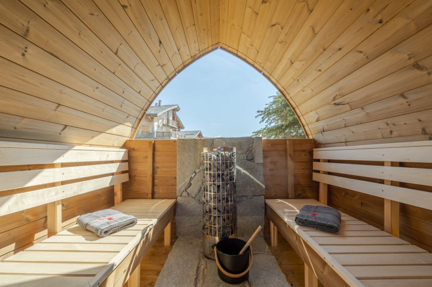 Il est composé de la pièce à vivre avec cuisine équipée (four, plaques de cuisson 4 feux au gaz, réfrigérateur, lave-vaisselle, four micro-ondes, grille-pain, cafetière et bouilloire électriques, machine L'Or Nespresso, cave à vin et un appareil à raclette) ouverte sur la salle à manger, de 4 chambres (2 chambres avec 1 lit double chacune, 1 chambre avec 2 lits simples et 1 chambre avec 3 lits simples dont deux superposés), chacune avec salle d'eau (douche, meuble vasque et wc), local à skis/vélos, un sauna et un jacuzzi sur la terrasse façon scandinave.
