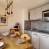 Cuisine : ouverte sur séjour : 4 plaques électriques, four traditionnel et four à micro ondes, réfrigérateur, lave vaisselle, cafetière.