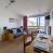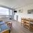 Cuisine avec 2 plaques vitro, four, micro-ondes, frigo, grille-pain, bouilloire et cafetière.