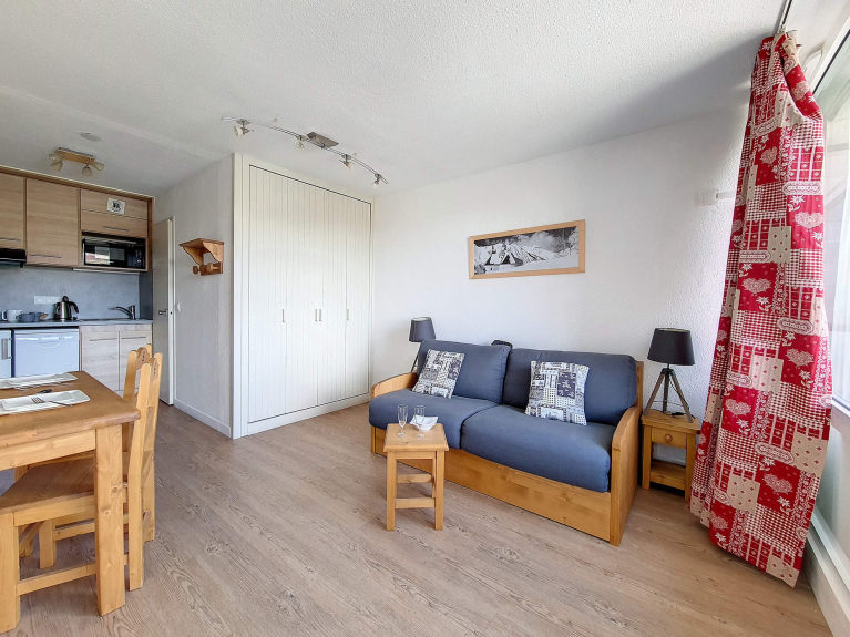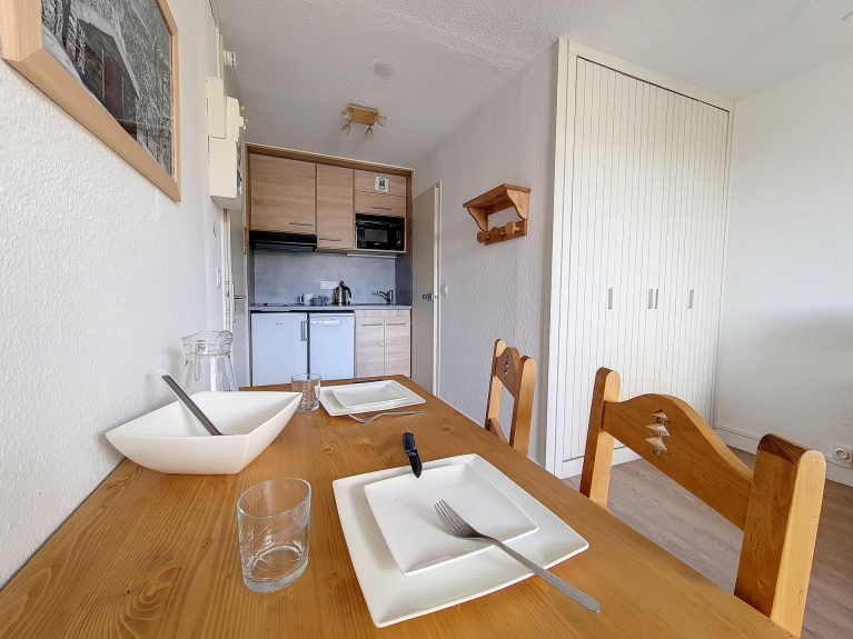 Elle a un accès direct aux pistes depuis le casier à skis situé au sous sol de l'immeuble. La garderie et le jardin d'enfant se trouvent à environ 300 mètres à pied de l'immeuble et à 100 mètres de la gare routière.
