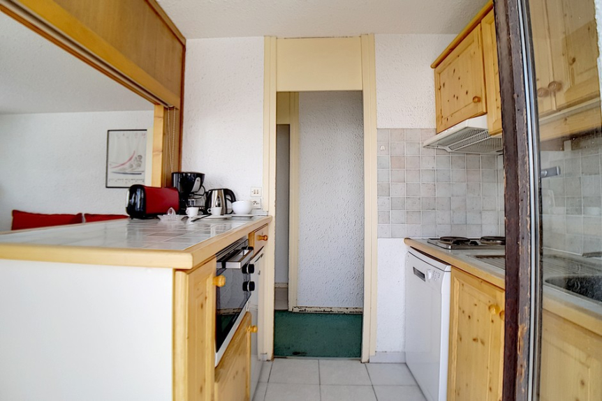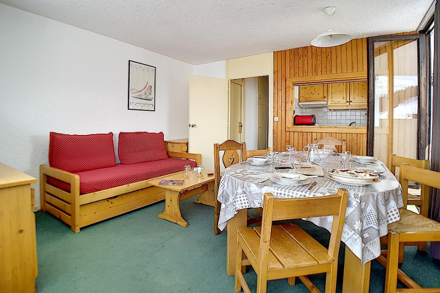 Appartement de 3 pièces 48m² pour 8 personnes. Il est situé au 8ème étage avec ascenseur. Il a un balcon exposé Sud avec la vue sur les pistes.
