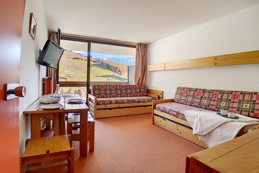 Séjour : 1 banquette lit 2 personnes (lit+ lit gigogne relevable) et 2 lits une personne. Equipé d'une télévison écran plat.