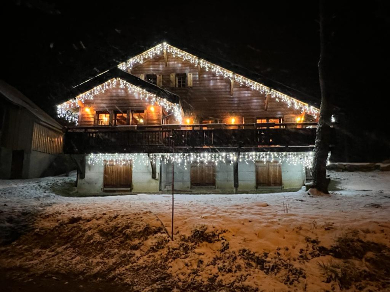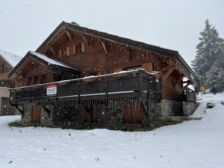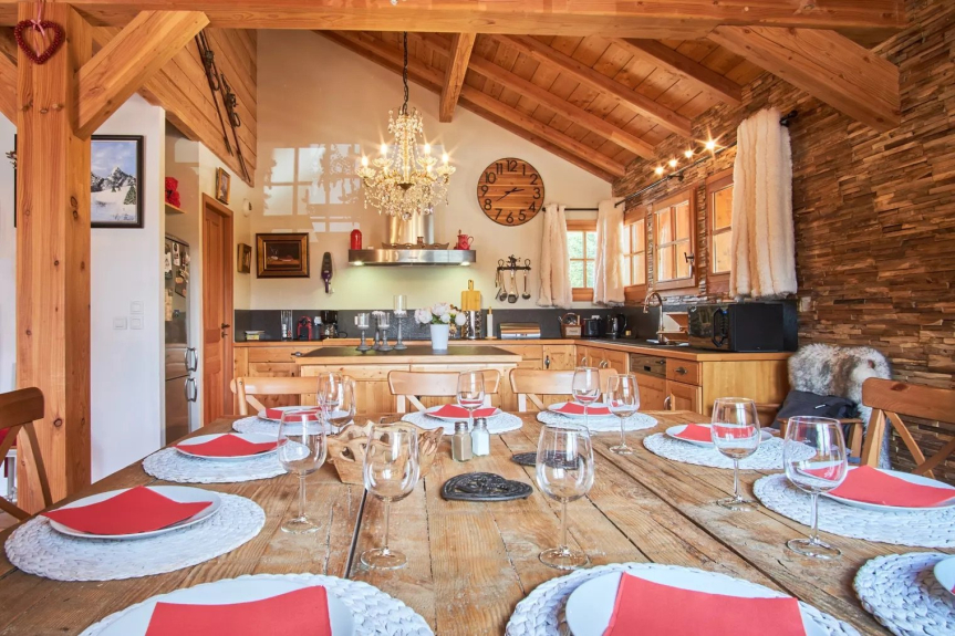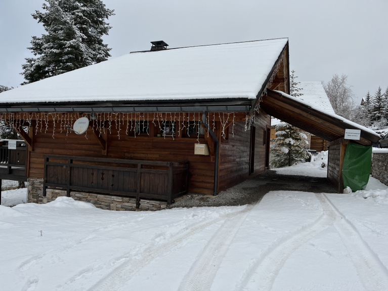 Chalet de 187m2 avec jardin et grande terrasse avec sa grande table et chaises, à 500m des pistes avec vue sur les montagnes environnantes.