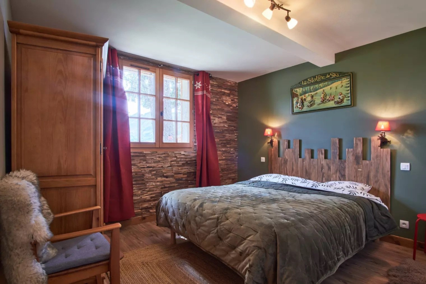 Le chalet est sur trois niveaux, avec toilettes à chaque niveau. Six chambres, 2 salle d’eau et une salle de bain, grande pièce de réception avec cuisine avec îlot central, une arrière cuisine avec sa propre entrée, (très pratique pour les courses, accès direct avec la cuisine) un abri voiture.