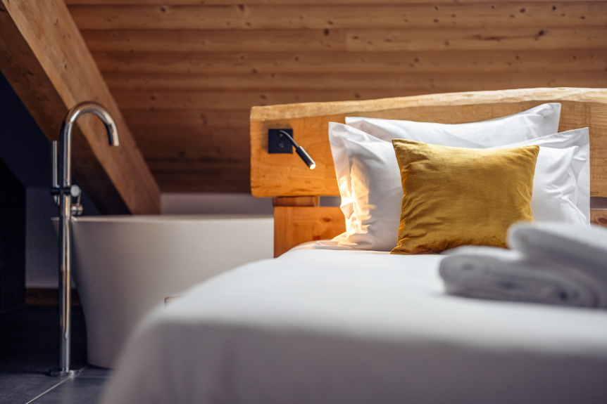 - Chambre 5 : suite parentale : lit double king size (180x200) avec baignoire dans la chambre, vasque, sèche cheveux