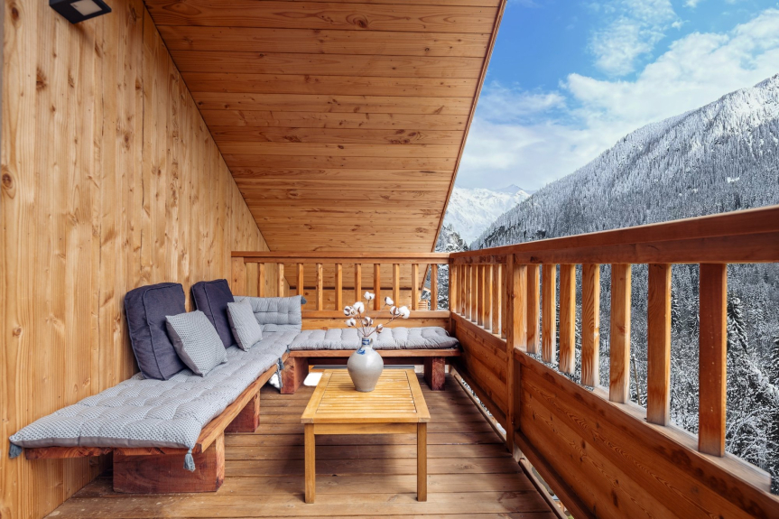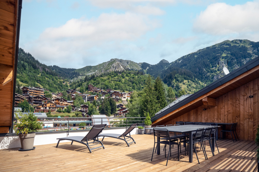 Côté salon, un grand balcon 20 m² aménagés avec une vue sur les montagnes et Courchevel. Équipements : table et chaise extérieures, transats.