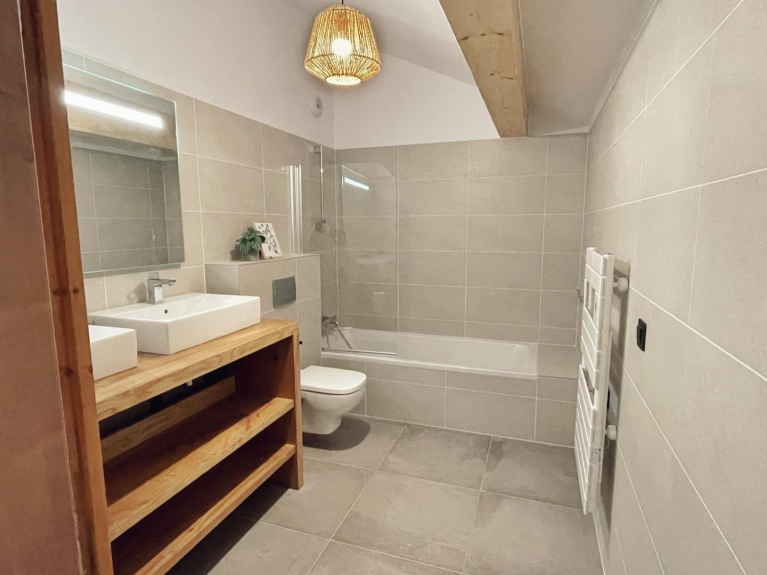 - Chambre enfant : 2 lits superposés (4 couchages) avec salle de bain en suite : baignoire, vasque, wc.
