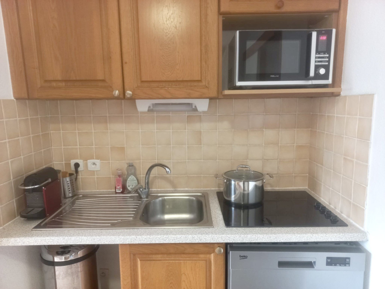 Kitchenette équipée : plaques de cuisson, lave vaisselle, four micro-onde, grand frigo, congélateur, cafetière filtre, cafetière Nespresso, appareil à raclette et fondue.