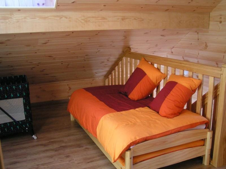 A l'étage 2 chambres une avec un lit double , l'autre avec 2 lits superposés ,vous avez également deux lits gigognes dans le coin montagne et une salle d'eau avec wc.
