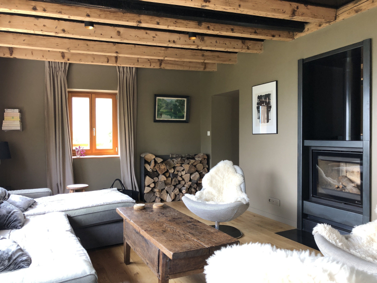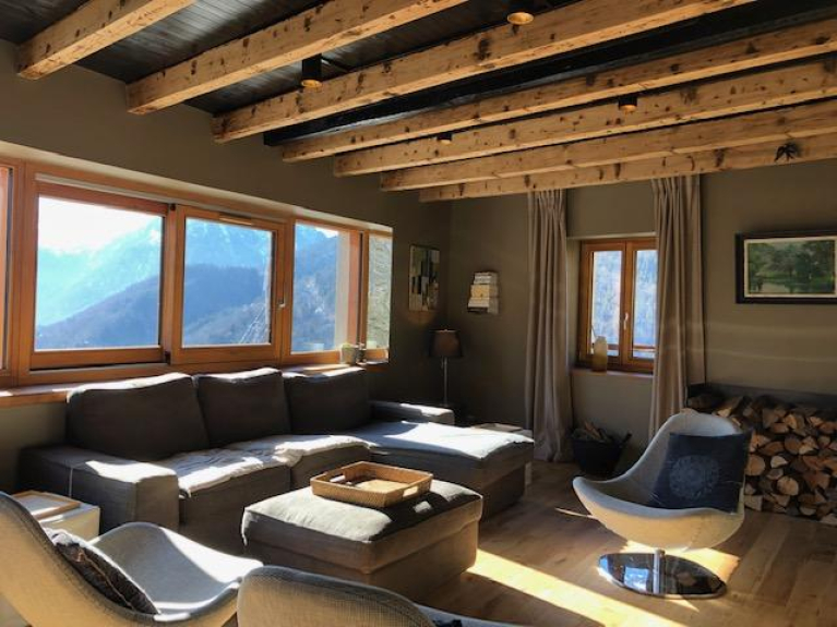 Salon chaleureux à l’ambiance cosy, avec cheminée pour des soirées au coin du feu (bois fourni) et vue imprenable sur les montagnes