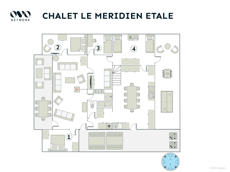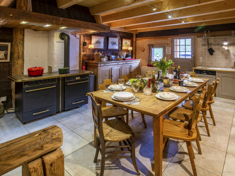 Veuillez noter que cette location est un appartement situé au rez-de-chaussée d'un chalet. Un deuxième appartement (Chalet Le Méridien Tournette) est aménagé au premier étage. Les grands groupes peuvent louer conjointement les 2 propriétés : l'appartement Tournette possède deux tables à manger et de nombreuses chaises, permettant à 15 personnes de partager leurs repas. Le Chalet Étale, en accord avec le style des propriétés locales de cette époque, a des plafonds bas comparé aux standards de construction moderne ainsi que de petites fenêtres. NB: le salle de jeux comprenant la table de ping pong et le babyfoot n'est pas chauffée pendant la saison hivernale.