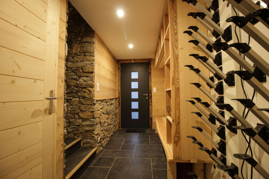 Rez-de-chaussée : entrée avec banc et casiers de rangement, sèche-chaussures et sèche-gants, garage avec lave-linge sèche-linge et grand réfrigérateur avec partie congélateur .