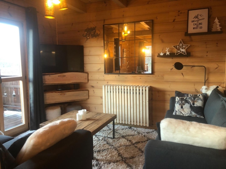Notre chalet de 60m2, entièrement équipé et récemment rénové est idéal pour 5/6 personnes. Au rez-de-chaussée, vous disposez d'un espace de vie chaleureux :