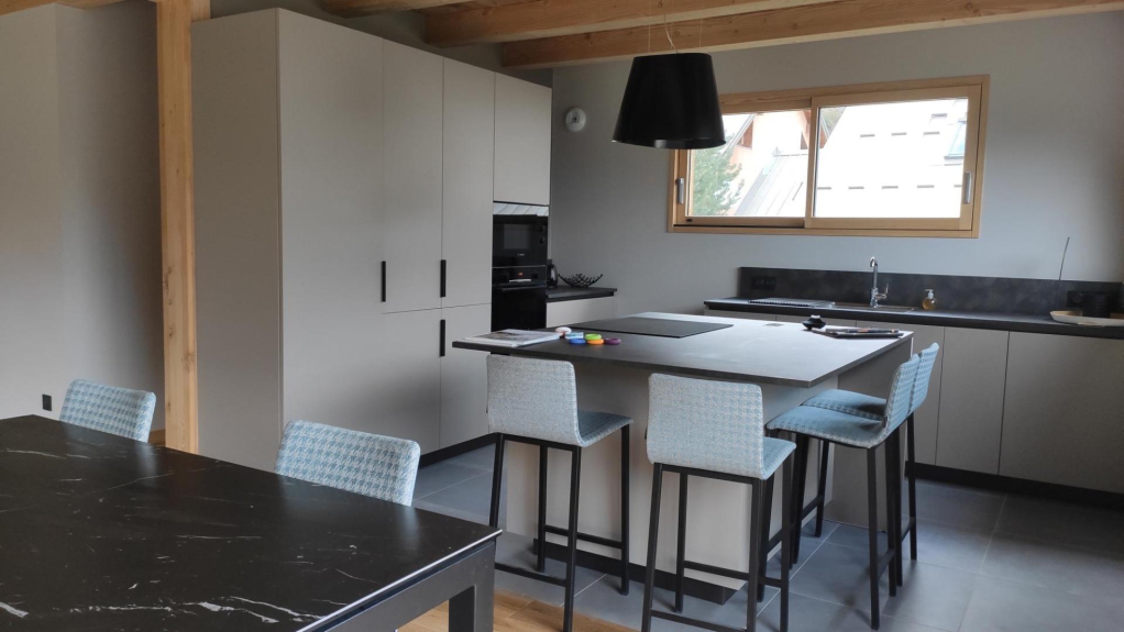 Cuisine toute équipée avec îlot central où l’on peut manger jusqu’à 4-5 personnes