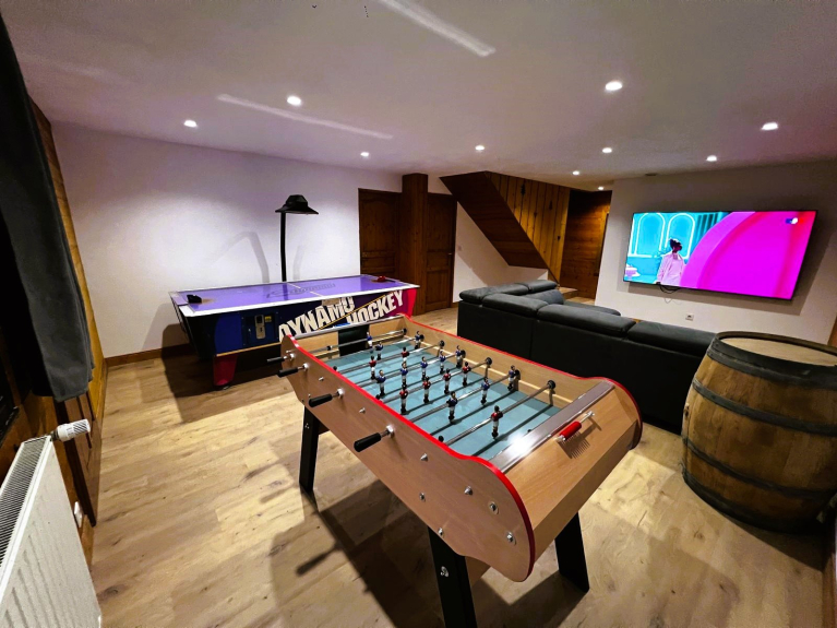 Au RDC une belle salle de jeu avec canapés, très grand écran, Playstation 5, Air Hokey et baby -foot permettra de passer des moments funs tous ensemble.