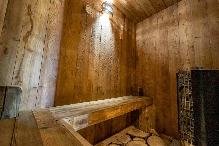 Grand séjour cathédrale avec charpente et murs en vieux bois, poêle à bois. Un spa sur le balcon offre une vue magique sur les couchers de soleil. Sauna, Salle de fitness. Netflix, OCS, AmzPvid.