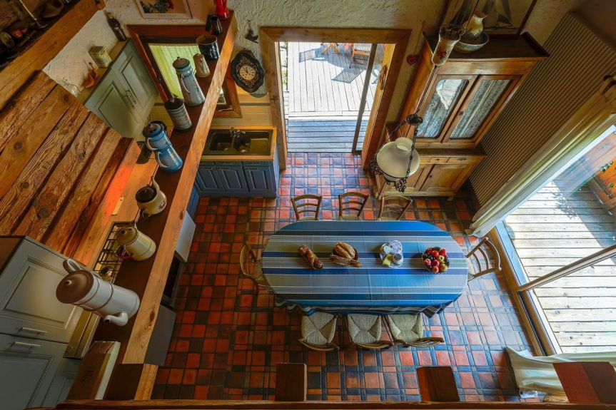 • Grand séjour (+de 50m²) avec cheminée comprenant coin repas, cuisine équipée (frigidaire, lave-vaisselle, cuisinière avec four à pyrolyse programmable, four micro-onde, appareils à raclette et fondue à disposition, etc…) et un bel espace salon avec canapés et fauteuils.