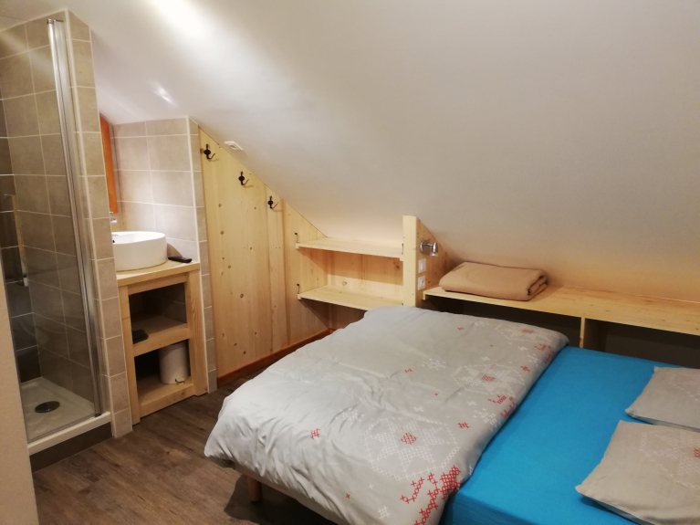 1 chambre avec un lit double avec sa douche et lavabo privatif, TV