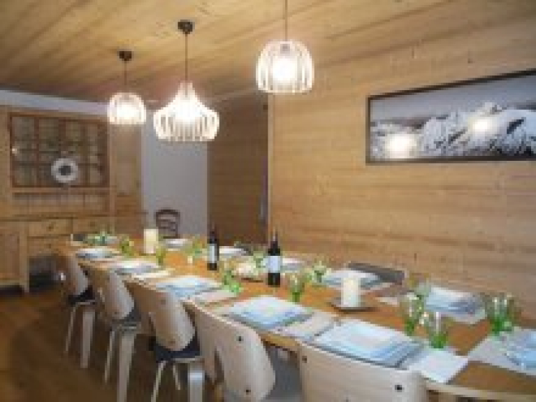 Cet espace à vivre de grande capacité réunie toutes les qualités d'un accueil en chalet de charme 4 étoiles, alliant le caractère ancien des meubles de montagne et le confort contemporain de chalet de montagne.