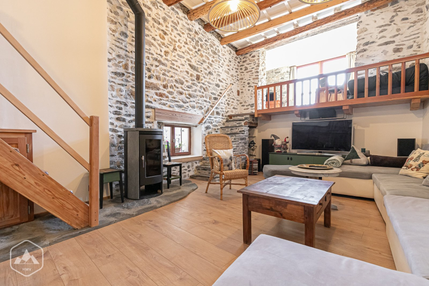 S'en suit un salon avec chauffage au sol, TV, puis mezzanine