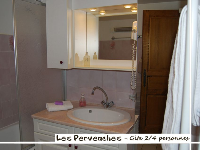 - une salle de bain avec baignoire et vasque sur meuble, sèche serviette, sèche cheveux mural, chauffage d’appoint. Machine à laver, étendage à linge, planche et fer à repasser, aspirateur, WC indépendant.