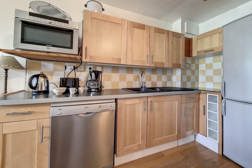 Cuisine : équipée avec 4 plaques de cuisson vitrocéramique, réfrigérateur avec congélateur, four micro-ondes/grill, grille-pain, cafetière, bouilloire électrique, lave-vaisselle.