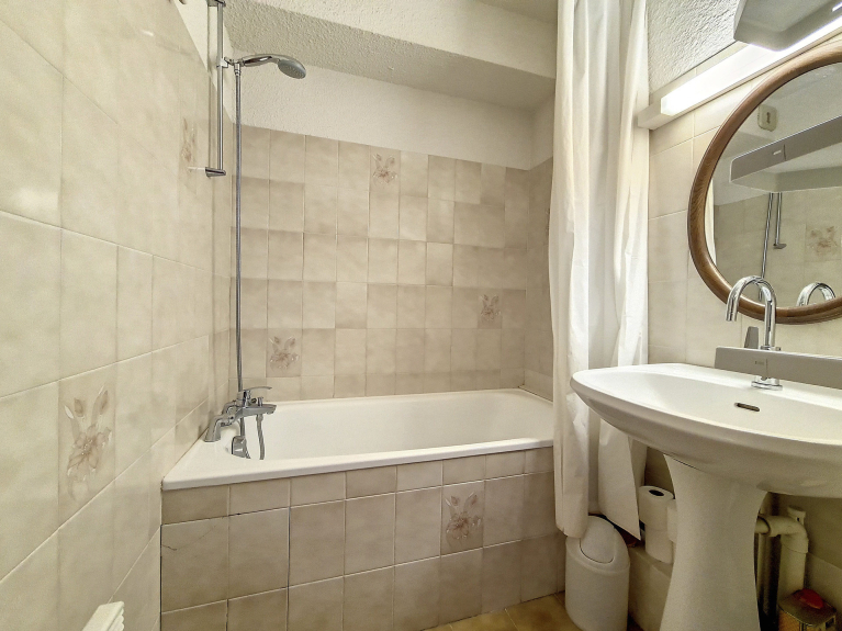 Il est situé au 1er étage (sans ascenseur) et possède un large balcon exposé SUD-OUEST avec un accès direct aux pistes (terrasse de plain pied).
