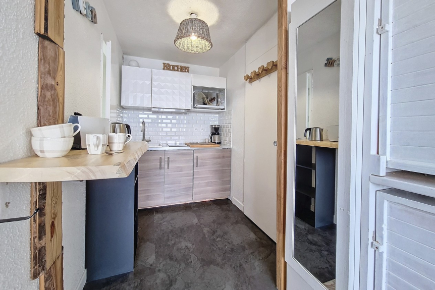 Studio rénové en 2023 de 17 m² pour 3 personnes. Il a un balcon NORD-OUEST et il est situé au rez de chaussée de l'immeuble dans un quartier animé.