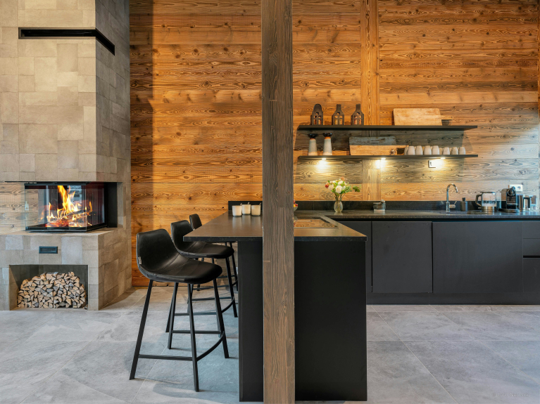 De grandes portes-fenêtres baignent la pièce de lumière naturelle, et une cheminée centrale garantit une atmosphère chaleureuse tout au long de l’hiver. La cuisine moderne est à l’arrière, séparée du salon par un simple comptoir.