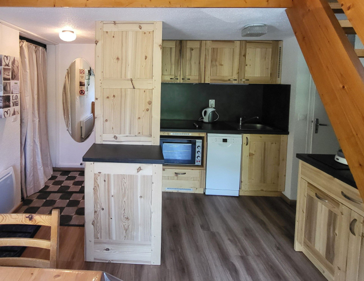 Cuisine : plaque vitrocéramique, réfrigérateur, mini four, micro-ondes, lave-vaisselle et tout le nécessaire de vaisselle
