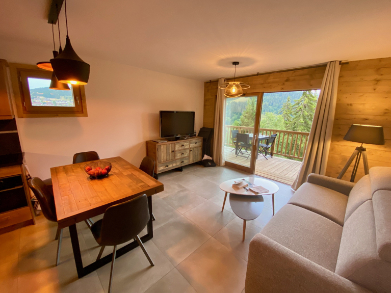 - Terrasse bois exposée Est, vue Village, Massif des Aravis et Mont-Blanc, Table 6 chaises.