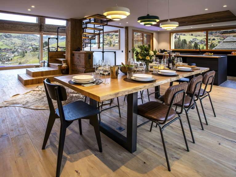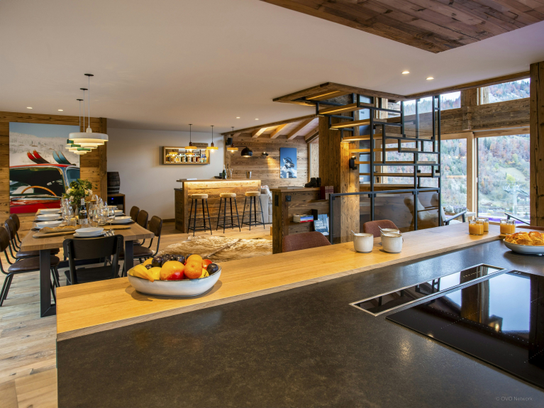 La pièce de vie a été soigneusement pensée, dans le but d’offrir une vue époustouflante, que vous soyez assis au salon, à la table à manger, ou bien en train de préparer le repas dans la cuisine toute équipée. De plus, une imposante terrasse panoramique permet de manger tous ensemble en profitant du bon air alpin ou du jacuzzi à la belle étoile.