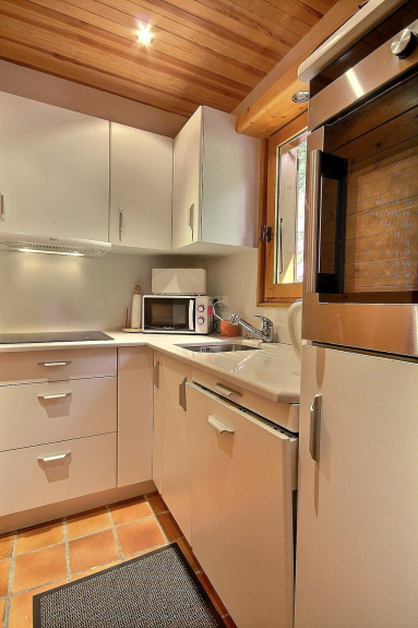 Cuisine séparée entièrement équipée (avec fenêtre) : réfrigérateur, plaques à induction, hotte aspirante, four, micro-ondes, lave-vaisselle