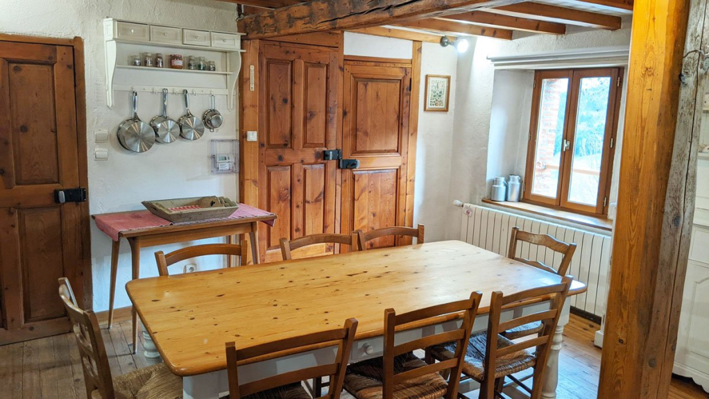 • 1 grande cuisine salle-à-manger avec espace salon et bureau (43m²), aménagée et tout équipée pour 22 places assises à table, vaisselle complète pour 22 personnes