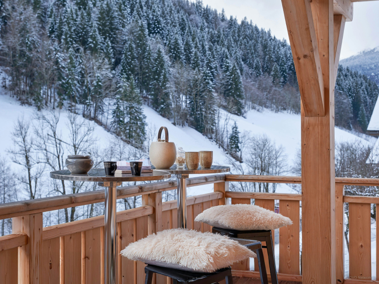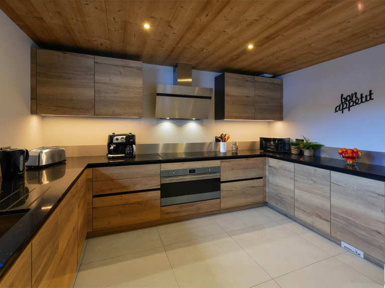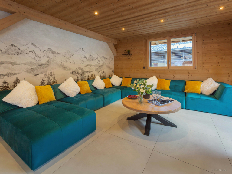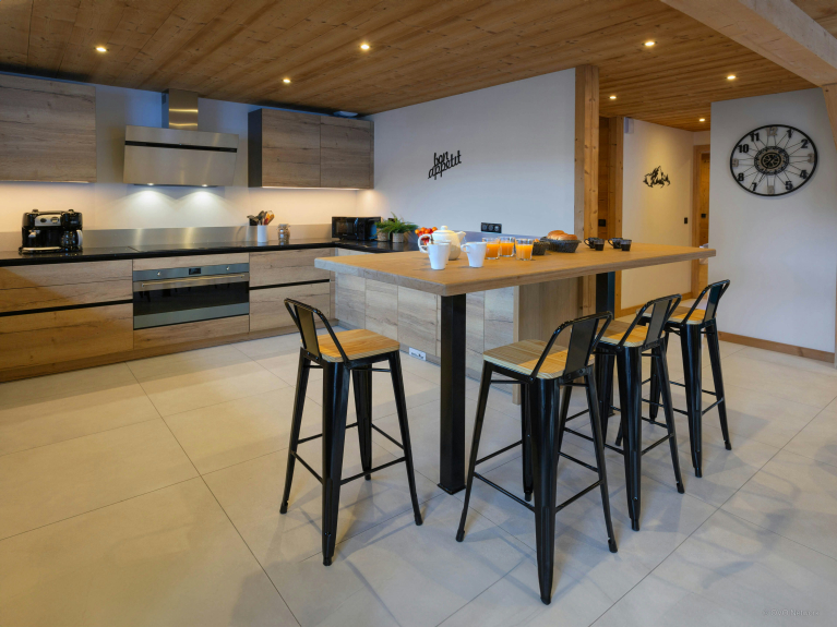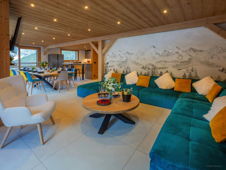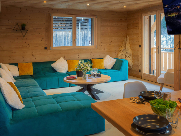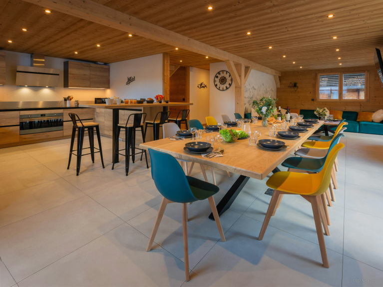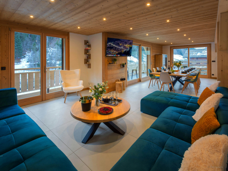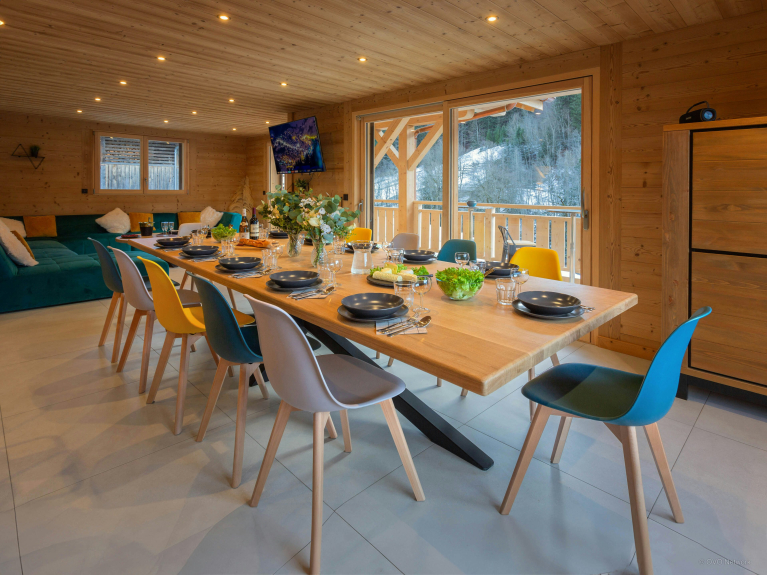 La grande pièce de vie ouverte est le lieu idéal pour décompresser en fin de journée. Plusieurs portes-fenêtres la baignent de lumière naturelle et ouvrent sur une terrasse panoramique qui permet de profiter de l’air alpin. Un immense canapé fait face à une télévision, et vous pourrez apprécier la vue depuis la table à manger.